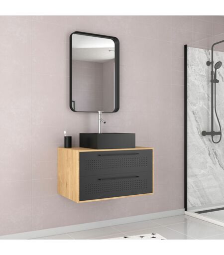 AURLANE Meuble salle de bains 80 cm, vasque carrée et miroir - chêne naturel et noir mat - uby