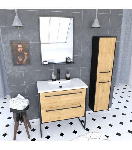 Caractéristiques du meuble : 80x50x81 cm Caisson en MDF et mélaminé noir mat Pieds et poignées en aluminium laqués noir mat Facade de tiroirs en MDF finition chêne naturel Livré monté Epaisseur des portes :18 mm Plan vasque blanche en résine avec trop plein Robinetterie non fournie 80x50 cm Epaisseur vasque :4 cm Caractéristiques du miroir : Miroir avec cadre et tablette en métal laqué noir mat 60x80 cm Caractéristiques de la colonne de rangement : 30x35x150 cm Colonne suspendue Caisson en noir mat 2 Portes en MDF finitions chêne naturel Poignées en aluminium laqués noir mat Epaisseur des portes :18 mm Epaisseur de la colonne de rangement : 34 mm Réference du produit:PACM069 Désignation du produit: STRUCTURA F060 Garantie 2 ans pièces et non main d'oeuvre. Référence produit: PACM069 ...