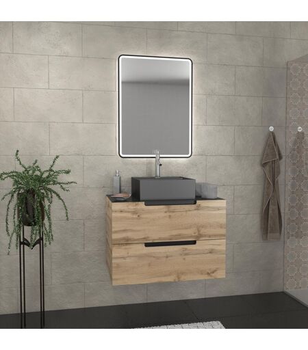 Meuble Salle De Bains 80 Cm 2 Tiroirs - Chêne Et Noir - Vasque Carrée - Miroir Black Led - Omega
