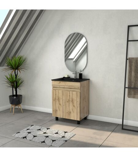 AURLANE Meuble salle de bains 60cm 2 portes chêne naturel + vasque noire et miroir ovale