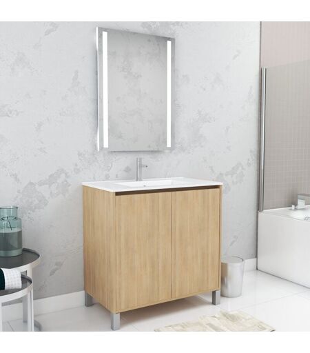 Aurlane - pack meuble salle de bains 80cm chêne clair 2 portes, vasque, miroir 60x80 à leds intégrées - xenos