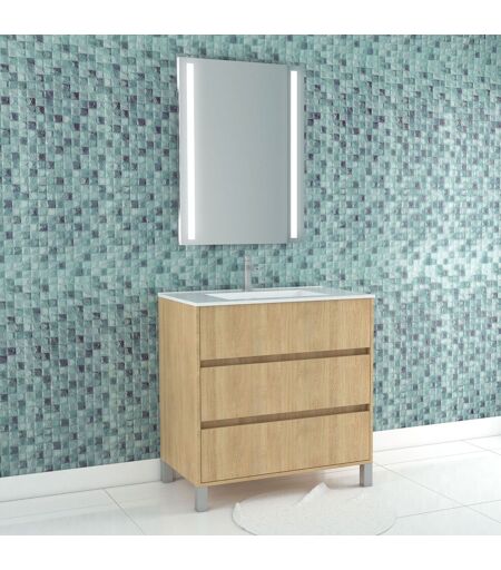 Pack Meuble Salle De Bains 80cm Chêne Clair 3 Tiroirs, Vasque, Miroir 60x80 À Leds Intégrées - Xenos