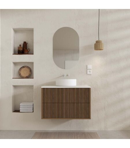 YUKI, le meuble à l’esprit Japandi. Plongez dans l’univers Japandi avec cette composition. Alliance subtile du raffinement japonais et de la douceur scandinave. Sa façade crantée bicolore bois et noir profond joue sur les reliefs pour apporter une forte présence déco à votre salle de bains, tout en conservant une esthétique épurée. Un Design minimaliste sans poignée grâce au système push-to-open (ouverture par simple pression) et soft-close (fermeture progressive, silencieuse et fluide).. Le plan de toilette blanc cassé laqué associé à la vasque ronde en céramique blanche mate, apporte une subtile touche organique à l'ensemble. Installation du caisson suspendu pour un gain de place et un nettoyage facilité. Caractéristiques techniques Meuble suspendu décor chêne et noir cranté - livré assemblé Caisson en mélaminé HDF 15 mm 2 tiroirs en mélaminé HDF 18 mm, décor intérieur/extérieur bois Ouverture 'push-to-open' Fermeture progressive 'soft-close' Plan de toilette en mélaminé HDF 18 mm ...