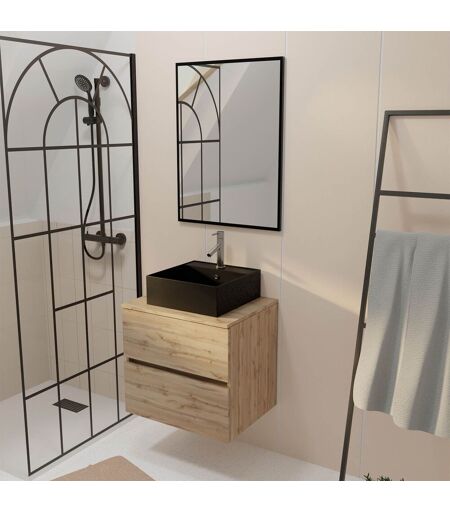 Meuble Salle De Bains 60cm 2 Tiroirs Chêne Naturel + Vasque Carrée Noire 41x41cm Et Miroir 60x80cm