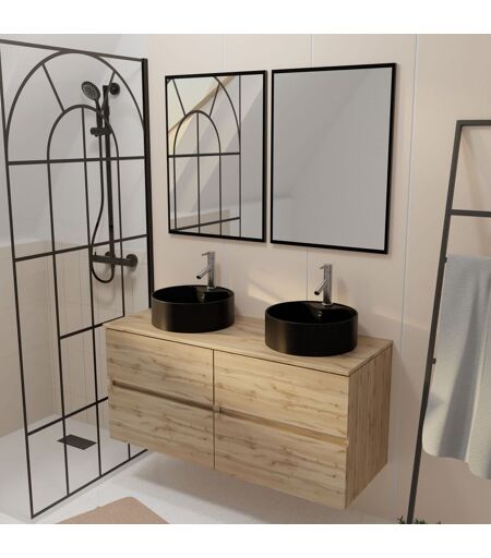 Meuble Salle De Bains 120cm 4 Tiroirs Chêne Naturel, 2 Vasques Noires Ø41cm Et 2 Miroirs 55x75 Cm