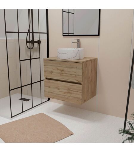 TIMBER, le meuble qui allie élégance et fonctionnalité ! Découvrez cet ensemble composé d¿un meuble de salle de bains et d¿une vasque à poser en céramique. Ce meuble aux lignes épurées a été conçu avec soin. Il est fabriqué en mélaminé décor chêne naturel. Matériau qui offre une durabilité exceptionnelle, résistant à l¿humidité et aux éclaboussures. Ses 2 tiroirs offrent un espace de rangement généreux pour vos produits de beauté, serviettes et autres essentiels. Caractéristiques, Meuble à suspendre Caisson et Plan en mélaminé décor Chêne naturel (ép. 16 mm) 2 tiroirs à fermeture progressive (soft-close) Vasque Ronde Ø36 cm en céramique Blanche Effet Marbre Caisson livré monté Robinetterie et bonde non fournies Dimensions : Caisson : 81x46x56 cm Vasque : Ø36x13 cm Référence produit : PACM747 Garantie 2 ans (Pièces uniquement) AURLANE développe des produits de salle de bains modernes, novateurs et compétitifs depuis 2003, pour rendre la salle de bains de vos rêves accessible ! Retrouvez plus d'informations techniques et conseils sur le site du fabricant AURLANE. Référence produit: PACM747 Retrouvez plus d'informations produit et des conseils de montage sur le site Aurlane. Remarques importantes: Ces colis sont volumineux, la livraison est effectuée par transporteur spécialisé en bas de chez vous. Les chauffeurs ne sont pas habilités à porter la marchandise, mais uniquement à la décharger. Pas de livraison à l'étage. L'adresse de livraison doit être accessible en camion poids lourd. Dans le cas contraire la marchandise sera mise à disposition au dépôt le plus proche (distance non garantie). Les rendez-vous sont gérés directement par les transporteurs. Attention à bien contrôler la marchandise à réception pour éviter tous litiges. ...