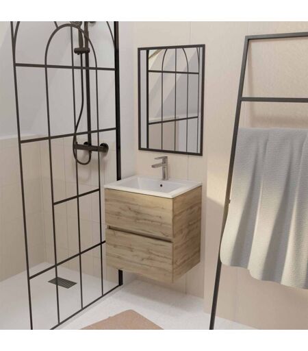 Aurlane - meuble de salle de bains 50cm timber - tiroirs décor chêne, vasque blanche et miroir cadre noir