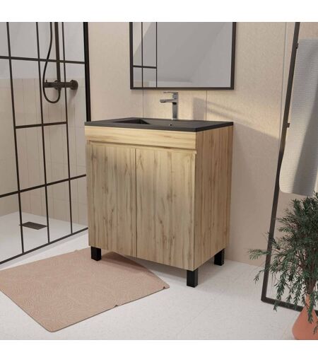TIMBER, un style sobre et actuel ! Apportez une touche naturelle et élégante à votre salle de bains avec ce meuble en mélaminé décor bois. Ses lignes épurées et sa finition bois chaleureuse créent une ambiance raffinée. Pratique et design, ses deux portes offrent un bel espace de rangement. Grâce à son système de fermeture douce 'Soft Close', profitez d'un confort optimal au quotidien. Un meuble aussi esthétique que fonctionnel ! Son design épuré est réhaussé par une vasque en céramique noire mate. Caractéristiques techniques Meuble sur pieds, livré monté Caisson en aggloméré mélaminé décor chêne naturel (ép. 16 mm) 2 portes à fermeture progressive (soft-close) Vasque en céramique noire mate Robinetterie et bonde non fournies Dimensions du caisson 70x46x81 cm Dimensions de la vasque 71x46.5x17 cm / Bords extérieurs 2 cm Référence produit : PACM803 Garantie 2 ans / Pièces uniquement Référence produit: PACM803 Retrouvez plus d'informations produit et des conseils de montage sur le site Aurlane. Remarques importantes: Ces colis sont volumineux, la livraison est effectuée par transporteur spécialisé en bas de chez vous. Les chauffeurs ne sont pas habilités à porter la marchandise, mais uniquement à la décharger. Pas de livraison à l'étage. L'adresse de livraison doit être accessible en camion poids lourd. Dans le cas contraire la marchandise sera mise à disposition au dépôt le plus proche (distance non garantie). Les rendez-vous sont gérés directement par les transporteurs. Attention à bien contrôler la marchandise à réception pour éviter tous litiges. ...