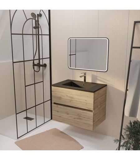 Meuble De Salle De Bains Suspendu 70 Timber Décor Chêne 2 Tiroirs Vasque Noire Et Miroir Led 70x50