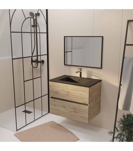Meuble De Salle De Bains Suspendu 70 Cm Timber Décor Chêne 2 Tiroirs Vasque Noire Et Miroir 70x50