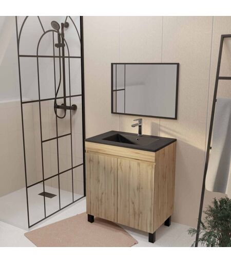 Aurlane - meuble de salle de bains 70cm timber décor chêne naturel à portes vasque noire et miroir 70x50