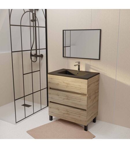 TIMBER, un style sobre et actuel ! Apportez une touche naturelle et élégante à votre salle de bains avec ce meuble en mélaminé décor bois. Ses lignes épurées et sa finition bois chaleureuse créent une ambiance raffinée. Pratique et design, ses 3 tiroirs offrent un bel espace de rangement. Grâce à son système de fermeture douce 'Soft Close', profitez d'un confort optimal au quotidien. Un meuble aussi esthétique que fonctionnel ! Son design épuré, réhaussé par une vasque en céramique noire et un miroir avec un encadrement noir, crée un contraste élégant et moderne. Caractéristiques techniques Meuble sur pieds, livré monté Caisson en aggloméré mélaminé décor chêne naturel (ép. 16 mm) 3 tiroirs à fermeture progressive (soft-close) Vasque en céramique noire Robinetterie et bonde non fournies Miroir avec encadrement en métal Noir Mat Dimensions du caisson 70x46x81 cm Dimensions de la vasque 71x46.5x17 cm / Bords extérieurs 2 cm Dimensions du miroir 70x50 cm (pose réversible) Référence ...