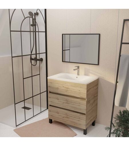 TIMBER, un style sobre et actuel ! Apportez une touche naturelle et élégante à votre salle de bains avec ce meuble en mélaminé décor bois. Ses lignes épurées et sa finition bois chaleureuse créent une ambiance raffinée. Pratique et design, ses 3 tiroirs offrent un bel espace de rangement. Grâce à son système de fermeture douce 'Soft Close', profitez d'un confort optimal au quotidien. Un meuble aussi esthétique que fonctionnel ! Son design épuré, réhaussé par une vasque en céramique blanche et un miroir avec un encadrement noir, crée un contraste élégant et moderne. Caractéristiques techniques Meuble sur pieds, livré monté Caisson en aggloméré mélaminé décor chêne naturel (ép. 16 mm) 3 tiroirs à fermeture progressive (soft-close) Vasque en céramique blanche Robinetterie et bonde non fournies Miroir avec encadrement en métal Noir Mat Dimensions du caisson 70x46x81 cm Dimensions de la vasque 71x46.5x17 cm / Bords extérieurs 2 cm Dimensions du miroir 70x50 cm (pose réversible) Référence ...