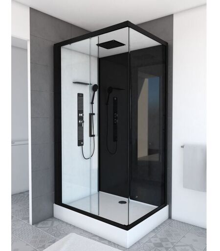 Description générale La cabine de douche DUALITY allie modernité et fonctionnalité avec son design noir et blanc. Elle comprend une porte coulissante avec fermeture magnétique pour une étanchéité optimale et un équipement complet en noir mat, allant de la douche de tête au panneau d'hydromassage. Spécifications techniques Dimensions : 80 x 110 x 215 cm Hauteur nécessaire pour installation : 230 cm Structure en aluminium noir mat Porte coulissante en verre trempé transparente de 6 mm, réversible Fond en verre trempé de 5 mm, noir et blanc Toit en verre blanc Receveur en acrylique renforcé blanc Fermeture magnétique Montage réversible Montage sans silicone Attestation de conformité sanitaire Compatibilité et accessoires Douche de tête pluie noir mat Panneau d’hydromassage multi jets anti-calcaire noir mat Douchette à main anti-calcaire avec flexible PVC noir mat Tablette en verre fumé Poignée noir mat Mitigeur mécanique Bonde grand débit de 90 mm Installation Facile à installer grâce à ...