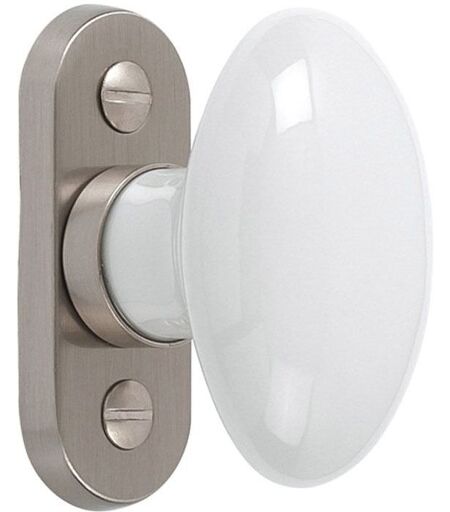 Bouton de crémone sur platine - Décor : Blanc / Inox - Hauteur : 77 mm - Largeur : 43 mm - Matériau : Porcelaine / Laiton Merigous