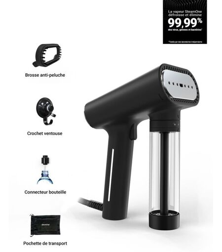 Puissant et rapide, le défroisseur EUNS150B de SteamOne vous offre un défroissage facile à tout moment ! Compact et prêt à l'emploi en 15 secondes, il redonne vitalité à vos vêtements en un clin d'oeil. Une puissance inégalée dans un format de poche Prêt à l'emploi en seulement 30 secondes, le défroisseur EUNS150B de SteamOne délivre des résultats exemplaires sur tous vos tissus, même les plus délicats, comme la soie ou la laine. La puissance impressionnante du défroisseur EUNS150B rafraîchit et assainit tous vos textiles en un clin d'oeil : sa puissance atteint 2000 watts pour éliminer les plis et les bactéries. Résultat : des vêtements frais et un look impeccable en quelques secondes. Avec un poids plume d'à peine plus d'un kilo, le défroisseur EUNS150B fait toute la différence et vous offre un défroissage ultra-efficace au quotidien, où que vous soyez. Assurez-vous des résultats fiables et une tenue impeccable en un clin d'oeil grâce à son débit vapeur jusqu'à 98°C constant et homogène, allant jusqu'à 30g par minute. Des fonctionnalités pensées pour votre quotidien Grâce à un design compact, ultra-élégant et pointu qui lui permet de vous suivre partout, en voyages d'affaires comme en vacances, le défroisseur EUNS150B vous offre une allure nette et soignée en toutes circonstances. Avec ce défroisseur signé SteamOne et ses quatre accessoires, dites adieu à votre planche à repasser et soignez votre linge en toute simplicité. SteamOne a doté son EUNS150B d' un réservoir d'eau de 150ml pour vous offrir une autonomie longue durée et des résultat impeccables sur tous vos vêtements en un seul passage. Robuste et pensé pour diriger la vapeur au coeur des tissus, le défroisseur EUNS150B est un appareil intuitif, au service de votre quotidien. Plus d'excuse pour vous offrir un look stylé jour après jour ! ...