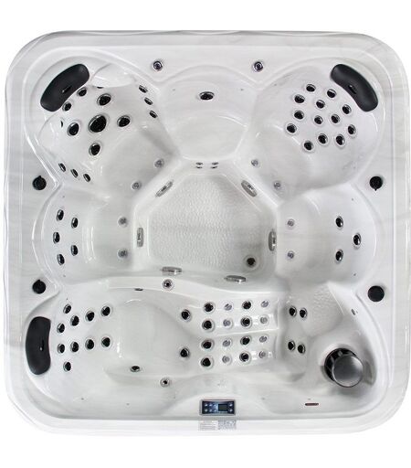 Dimensions : 220 x 220 x 95 cm //// Nombre et type de places : 6 places : 5 assises, 1 allongée //// Jets de massages : 69 jets en acier inoxydable //// Aérojets : 16 jets rétro-éclairés en acier inoxydable //// Pompe à eau : 2 x 1,5 kW soit 2 x 2 CV + 1 x 1,875 kW soit 1 x 2,5 CV - WHIRLPOOL (lx) //// Pompe bulleur : 1 x 0,7 kW - WHIRLPOOL (lx) //// Pompe de filtration : 1 x 0,375 kW soit 1 x 0,5 CV - WHIRLPOOL (lx) //// Type de filtration : Skimmer + filtre cartouche //// Réchauffeur : BALBOA 1 x 3 kW + sonde permettant de conserver une eau à température souhaitée //// Panneau de contrôle : Écran LCD BALBOA VL801D (centrale GS523DZ) //// Réglages : Départ différé, durée des cycles de chauffe et de filtration //// Système de protection : Sécurité antigel ; protection contre la marche à vide; anticorrosion ; anti-débordement //// Fontaines : 2 x fontaines rétro-éclairées //// Chromothérapie : 18 x leds à couleurs variables //// Aromathérapie : Diffuseur intégré - 1 recharge lavande offerte //// Ozonateur : O3 zone (50mg/h) //// Coussins : 3 x appuie-têtes avec logos rétro-éclairés //// Jupe / Habillage : Panneaux en composite, entretien minimal //// Châssis : INOX, soutien périphérique //// Isolation : I. Cuve (mousse polyuréthane expansée) - II. Socle ABS renforcé de fibre + film réflecteur - III. Panneau (film réflecteur) - IV. Housse isolante, idéale pour les périodes de non utilisation //// Les avantages Spalnéa : Composants de qualité MADE IN USA : acrylique Aristech, réchauffeur Balboa, centrale électronique Balboa, panneau de commande Balboa //// Puissance maximale : 5,95 kW / 25,87 A (230 V) - avec réglage d'origine, réchauffeur de 3kW délesté //// Poids : 387 kg //// Volume d'eau : 1 385 litres. ...
