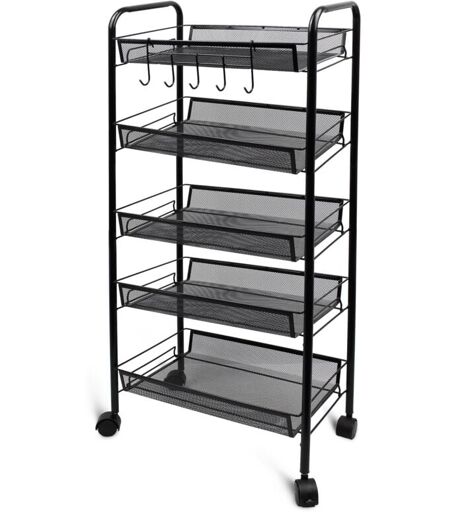 Obtenez encore plus d'espace de rangement dans votre cuisine, salle de bain ou buanderie avec ce chariot à roues. Conçu avec de l'acier durable, le produit est simple, élégant et robuste. Monté sur roues, le chariot peut être déplacé avec aisance - tout ce dont vous avez besoin est à portée de main. Les roues peuvent être verrouillées pour assurer que le chariot reste bien en place. De plus, les étagères vous fourniront assez d'espace pour ranger vos céréales, produits ménagers, et beaucoup plus. Caractéristiques produit: Matériau: Fer Dimensions des paniers: 41 x 27 x 6 cm Distance entre les paniers: 14 cm Charge maximale: 25 kg par panier Poids du carton: 3.7 kg Taille du carton: 56.0 x 30.5 x 17.0 cm Points favoris: Il est facile de déplacer le chariot avec les 4 roues intégrées C'est un excellent produit pour organiser vos affaires avec l'espace de stockage fourni Il peut être stocké dans un petit espace grâce à son design unique et fonctionnel Portable: il est facile à ...