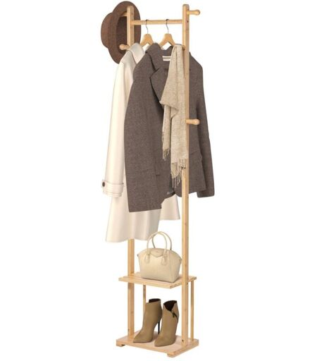 TODECO Porte Manteau Sur Pieds Bambou avec étagère à 2 niveaux, 6 Patères et Tringles, Tapis Antidérapant, Portemanteaux pour Entrée Bain Masion Chambre
