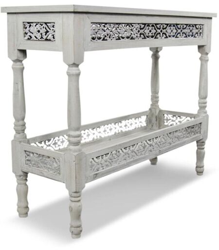 Caractéristiques techniques : Largeur (cm) : 98 Profondeur (cm) : 35 Hauteur (cm) : 77.5 Poids (kg) : 8.5 Matériaux : Bois Essence bois : Sapin Couleur : Blanc Vous êtes à la recherche d'une pièce authentique pour illuminer votre décoration ? Laissez-vous séduire par le charme de ce meuble console en bois. On raffole des détails du bois et des jolies arabesques qui décorent les plateaux. C’est à la fois chic et sophistiqué ! Retrouvez tous nos produits en effectuant une recherche sur « DECORATION DAUTREFOIS ». ...