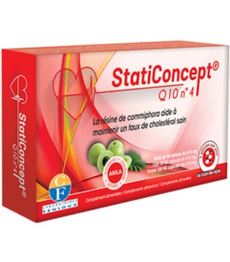 Complément alimentaire à utiliser dans le cadre d’une alimentation variée, équilibrée et d’un mode de vie sain.Le cholestérol est un acide gras qui a deux origines, il est soit synthétisé par notre organisme soit apporté par notre alimentation. Il est indispensable à la synthèse de nombreuses hormones et à la structure des membranes cellulaires.Cependant, pour maintenir une bonne santé cardiovasculaire, il est nécessaire d'équilibrer son taux de cholestérol sanguin. Dans les cas où une amélioration de l'hygiène de vie ne suffit pas, la prise d'un complément alimentaire tel que le StatiConcept® Q10 n°4 des Laboratoires Fenioux peut peut être un complément approprié.Cette nouvelle formulation contient de l'extrait d'amla, de la coenzyme Q10, du policosanol, de la levure de riz rouge et de la résine de commiphora.IngrédientsExtrait de Commiphora (Commiphora mukul) , Extrait d'Amla (Phyllanthus emblica), Gélule (gélatine), Levure de riz rouge (Monascus purpureus) à 2% de monacoline K, Coenzyme Q10, Policosanol extrait de canne à sucre (Saccharum officinarum), Antiagglomérant : stéarate de magnésiumDonnées nutritionnelles3 gélules par jour contiennent :Extrait de gomme d'oléo-résine de commiphora508 mgExtrait de fruit d'amla500 mgLevure de riz rouge132 mgsoit monacoline K2.8 mgCoenzyme Q1060 mgPolicosanol extrait de canne à sucre30 mgConseils d'utilisationsDose journalière recommandée1 gélule matin, midi et soir avec un grand verre d'eau au cours des repas.Précautions d'emploiConserver dans un endroit frais et sec.Tenir hors de portée des enfants.Ne pas dépasser la dose recommandée.Ne doit pas être consommé par les femmes enceintes ou allaitantes, les enfants de moins de 18 ans et les adultes de plus de 70 ans, les personnes ayant des problèmes hépatiques, rénaux ou musculaires, les personnes intolérantes aux statines.Déconseillé en cas de prise de médicaments hypolipémiants ou de consommation concomitante de pamplemousse (jus ou fruit).Ne pas consommer en cas de prise de médicaments pour réduire le cholestérol.Ne pas consommer en cas de consommation d'un autre produit contenant de la levure de riz rouge.Réservé à l'adulte.Poids net60 gélulesFabricantLaboratoires Fenioux (Benelux) SprlWaterloo Office ParkDrève Richelle 161/Batiment B1410 WaterlooBelgique ...