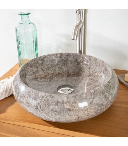 La vasque à poser en marbre gris Venise, à la fois pratique et esthétique, offre une salle de bain design et moderne. Votre salle d'eau devient un lieu de détente et d'apaisement grâce à cette vasque ronde en pierre de qualité. Ce lavabo à poser en marbre véritable offre à votre espace bain une touche déco indémodable. Nos meubles de salle de bain s'accordent parfaitement avec cette vasque entièrement polie et lisse. Taillée artisanalement dans la masse, la vasque en pierre naturelle Venise existe également en marbre crème et noir. Vasque vendue seule. Perçage aux normes européennes. Photos non contractuelles. Chaque pièce est unique. Dimensions vasque Diamètre : 40 cm Hauteur : 12,5 cm Poids : 28 kg Couleur : Gris taupe Voir les bondes compatibles (vendues séparement) Chromée Noire Blanche Nous vous conseillons l'application d'un hydrofuge anti-taches pour les vasques en marbre et pierre naturelle. ...