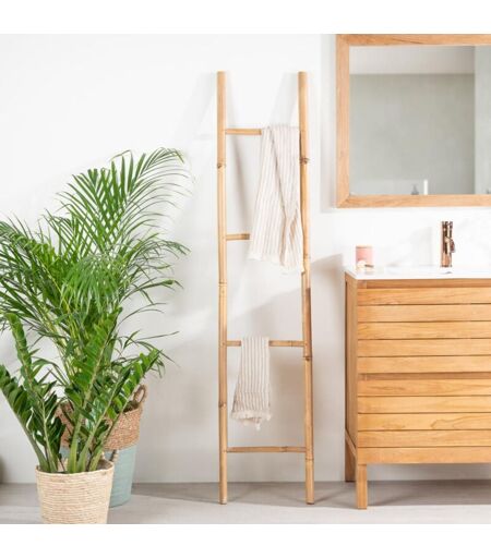 Optez pour le porte-serviette échelle en bambou couleur naturelle pour déposer vos serviettes de toilette. Cet accessoire vous offre quatre niveaux destinés à accueillir vos serviettes. Votre salle de bain se transforme en un lieu exotique et chaleureux. Ce support permet un rangement esthétique et pratique dans votre salle d'eau. Nos meubles de salle de bain en teck s'accordent parfaitement avec ce produit. Cet article est disponible également en blanc. Echelle vendue seule. Dimensions: Longueur: 37 cm, Profondeur: 4 cm, Hauteur: 170 cm. ...