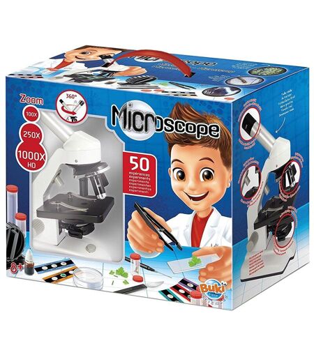 Parfait pour réaliser ses premières expériences et s'initier aux plaisirs de la science, ce microscope 50 expériences de Buki contient tout le nécessaire pour explorer de près le monde qui nous entoure. Un outil résistant et performant Avec ce coffret microscope 50 expériences, Buki propose aux apprentis scientifiques un outil à la fois résistant, performant et agréable à utiliser. Conçu entièrement en métal, il offre 3 zooms HD permettant de régler l'agrandissement selon les besoins de l'analyse : 100 X, 200 X ou 1000 X. Muni en outre d' optiques et oculaires en verre, ce microscope pour enfant assure une observation de grande qualité. Il permet donc aux scientifiques en herbe de découvrir avec une netteté parfaite les plus petits organismes et d'observer leur évolution, leurs formes ou encore leurs constitutions sans aucune difficulté. Un coffret complet pour une initiation parfaite Livré avec un large choix d'accessoires, ce coffret microscope est idéal pour attiser la curiosité des petits scientifiques. Cellules végétales issues d'un bulbe d'oignon, papier journal, extrait de salive, bactéries de yaourt ou encore champignon du roquefort, les échantillons proposés sont variés et tous issus du quotidien de l'enfant. Ce coffret comporte également tout un panel d'instruments, parfaites répliques des outils utilisés par les véritables chercheurs. De la lamelle à la pince en passant par la boite de Petri ou encore le micro trancheur, les enfants pourront aisément réaliser leurs propres prélèvements d'échantillons pour les analyser au microscope. ...