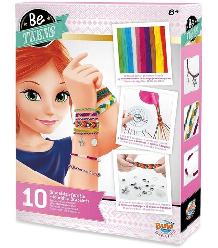 Cr?e 10 bracelets tendances avec des fils de coton, des perles et des breloques !. Utilise la roue en mousse ou la ventouse pour maintenir ton bracelet. Ce kit contient :. - 10 couleurs de fil de coton. - 16 breloques. - 2 anneaux. - 1 roue en mousse. - 1 ventouse. - Noctice en couleurs A partir de 8 ans ...
