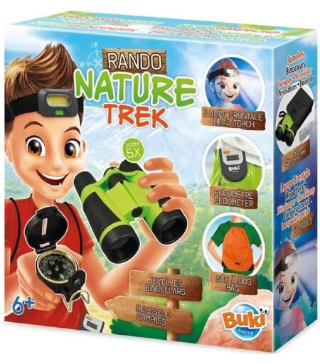 BUKI FRANCE Randonnée Nature - Un coffret pour partir a la découverte de la nature et faire ses premieres randonnées - Un podometre compte les pas et permet de savoir la distance parcourue - Inclus : Jumelles 5x32 mm, une lampe frontale, une boussole, un podometre, un sac de ... ...