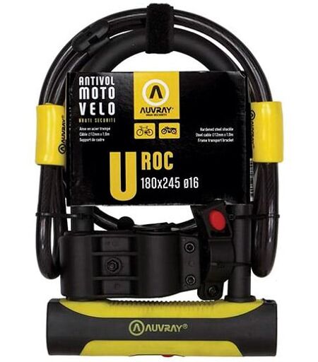 Antivol en U Auvray U-Roc 180x245mm Câble de 100 mm est un choix idéal pour assurer la sécurité de votre vélo. Sa manille en acier haute résistance Ø 16 mm et son corps en acier offrent une protection fiable. Livré avec 2 clés plates fraisées pour une utilisation pratique.Cet antivol comprend un support pour le cadre du vélo pour un transport facile. Le câble haute résistance, diamètre 12 mm x 1,0 m, avec son support selle, ajoute une couche supplémentaire de sécurité. Les dimensions du cadenas en U sont de 180 x 245 mm, offrant une protection adéquate pour votre vélo.Avec un niveau de sécurité 8/10 et une garantie de 2 ans, l'Antivol en U Auvray U-Roc est un investissement sûr pour protéger votre vélo contre le vol. Optez pour la tranquillité d'esprit lors de vos déplacements à vélo avec ce produit de qualité. ...