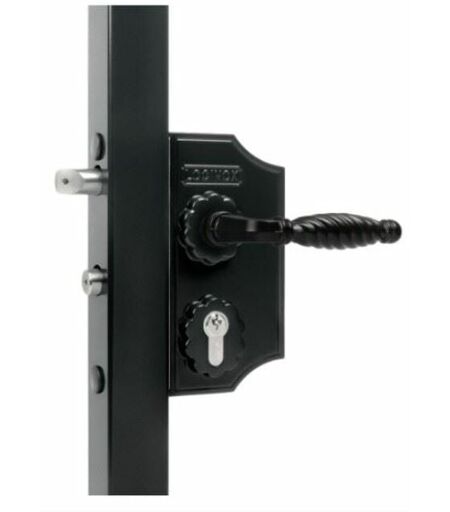 Descriptif Serrure de style fer forgé avec petit coffre (160 x 80mm), couleur NOIR RAL 9005 fournie avec poignée 3006FA en zamak. Cette serrure est adapatable sur les profils carrés réglables de 40 à 50mm. **Gâche non fournie, nous vous recommandons les gâches ref LOSPKZQF40, LOSPKZTK40 ou la gâche électrique LOMODULECSA** **disponible en coloris : ZILVER, vert RAL 6005, Vert RAL 6009, Gris RAL 7016 ou blanc RAL 9010. Si vous souhaitez recevoir la serrure de l'un de ses coloris, merci de le préciser par mail en commentaire lors de votre commande** Avantage : Coffre très résistant (testé à 1000heures contre le brouillard salin) Ancrage de 23 mm dun pêne de nuit et en un tour de clé. Pêne demin-tour réversible aisément Remarque: entraxe entre les pênes : 60mm 4 trous , fixation par 2 vis BTR Charnières ornementales adaptables: LOGORNALRZM20 LOGORNAWPBM20 ...
