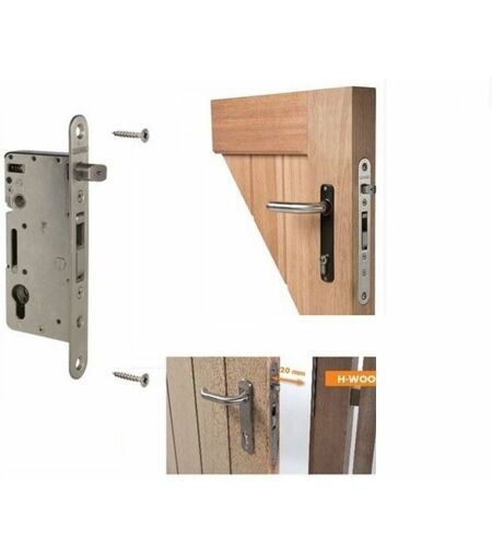 Serrure à encastrer 100% acier inoxydable avec un axe de 60 mm (têtière - cylindre) spécialement conçu pour les portes battantes en bois . Pêne demi-tour réversible et réglable de 20 mm, pêne dormant en forme de crochet basculant afin d'éviter l'écartement des vantaux. La combinaison des deux pênes assure un verrouillage sûr et sécuritaire. La charnière 4DW en combinaison avec la serrure à encastrer H-Wood est la solution idéale pour les portes en bois, cela vous permet davoir une possibilité de réglage optimale. Avantages · Pêne demi-tour réversible facilement sans démontage · Rappel du pêne demi-tour à la clé · Réglage du pêne demi-tour de 20 mm en continu sans démontage · Mécanisme, crochet, têtière, pêne demi-tour: acier inoxydable · Ancrage de nuit: crochet en acier inoxydable · Ancrage du crochet: 33 mm · Entraxe entre le cylindre et le carré: 92 mm · Axe à 60 mm (distance entre la têtière et le carré ou le cylindre) · La plaque de protection en polyamide sur le mécanisme ...