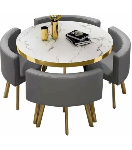 ATTENTION : Livraison en pas de porte uniquement Design moderne et économiseur d'espace - L' ensemble table à manger rond et chaise PopUp est multifonctionnelle et modulable. Ses chaises se glissent parfaitement sous son plateau. Une création rusée, idéale pour les locataires à la recherche de gain d'espace. - La table de salle à manger rond PopUp est un modèle pratique pensé pour ceux et celles qui cherchent à gagner de la place dans leur cuisine ou séjour. Ensemble table + 4 chaises au look ultra contemporain ! Avec sa structure en métal effet or, son plateau en MDF et le revêtement en simili doux et résistant de ses chaises, c'est sûr que cet ensemble pratique trouvera sa place dans tous les intérieurs modernes ! - Caractéristiques techniques : Dimensions Table : Longueur 90 cm Profondeur 90 cm Hauteur 75 cm. Assise Hauteur 44 cm. Dimensions Chaises : Longueur 50 cm Profondeur 45 cm Hauteur 77 cm. Couleurs disponibles : Effet marbre blanc chaises gris pieds couleur or Effet marbre ...