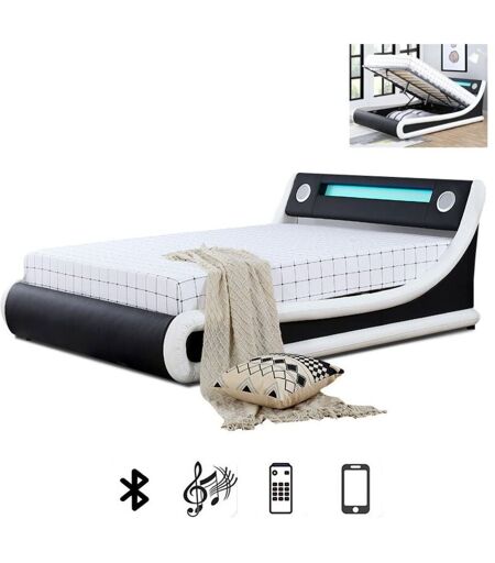 ATTENTION : Livraison en pas de porte uniquement Le moyen facile d'apporter un style moderne et avant gardiste à votre chambre à coucher Fabriqué en simili cuir, en mousse de polyuréthane et en bois, ce lit double est un ajout excellent à votre chambre à coucher. La matière en simili cuir légèrement texturé est doux au toucher et facile à nettoyer. Pas besoin de sommier en plus. Ajoutez simplement un matelas puis installez-vous pour une bonne nuit de sommeil! Le système de plate-forme à 24 lattes offre un soutien complet et cohérent pour votre matelas La tête de lit munie d'un éclairage à LED vous offre une ambiance chaleureuse et illumine votre nuit en apportant une touche d'esthétique unique. Elle comporte également deux hauts parleurs situés de part et d'autre pour une atmosphère parfaite. Vous pourrez ainsi connecter votre Smartphone au Bluetooth et passer une excellente soirée. La tête de lit arquée possède un rembourrage intégral rempli de mousse pour fournir la bonne quantité ...
