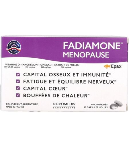 Complément alimentaire à utiliser dans le cadre d’une alimentation variée, équilibrée et d’un mode de vie sain.Laboratoire Novomedis Fadiamone Ménopause est un complément alimentaire sous forme de comprimés et de capsules, formulé pour les femmes en période de ménopause. Il associe vitamine D3, magnésium marin, oméga-3 et extrait de pollen afin de réduire la fatigue, soutenir le système nerveux, renforcer les os et atténuer les bouffées de chaleur. Fabriqué en France.IngrédientsComprimés : Extrait de pollen, citrate de magnésium, oxyde de magnésium marin et bisglycinate de magnésium, agents de charge : cellulose microcristalline, phosphate tricalcique, agents anti-agglomérants : mono- et diglycérides d'acides gras, vitamine D3.Capsules : Huile de POISSON*, gélatine de POISSON, humectant : glycérol, antioxydants : extraits de romarin et mélange de tocophérols.*Huile de POISSON produite en Norvège, qualité ultra pure.Allergènes : Poisson.Valeurs nutritionnelles Pour 2 comprimés + 1 capsuleVNR* Vitamine D320 µg400% Magnésium150 mg40% Oméga 3 (EPA et DHA)260 mg- Extrait de pollen300 mg- *VNR : Valeur Nutritionnelle de RéférenceConseils d'utilisationPrendre 2 comprimés le matin de préférence, et 1 capsule au moment de votre choix, avec un grand verre d’eau.Précautions d'emploiNe pas dépasser la dose journalière recommandée. Tenir hors de portée des jeunes enfants. Déconseillé aux enfants, femmes enceintes ou allaitantes. Ce complément alimentaire ne remplace pas une alimentation variée et équilibrée ni un mode de vie sain. À conserver à l’abri de la chaleur et de la lumière.Poids net60 comprimés + 30 capsules = 49 gAdresse du FabricantLaboratoire Novomedis1 rue de la Nau des Vignes51520 La Veuve, France ...