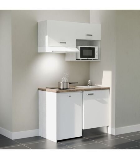 CUISIBANE Kitchenette K02L-PT - 120 cm avec plan de travail et évier - emplacements frigo, hotte et micro-ondes - Façade Blanc - Plan Bois - Evier Inox