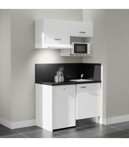 CUISIBANE Kitchenette K02L-PT - 120 cm avec plan de travail et évier - emplacements frigo, hotte et micro-ondes - Façade Blanc - Plan Noir texturé - Evier Inox