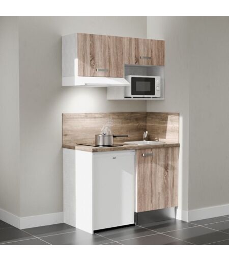 CUISIBANE Kitchenette K02L-PT - 120 cm avec plan de travail et évier - emplacements frigo, hotte et micro-ondes - Façade Bois - Plan Bois - Evier Inox