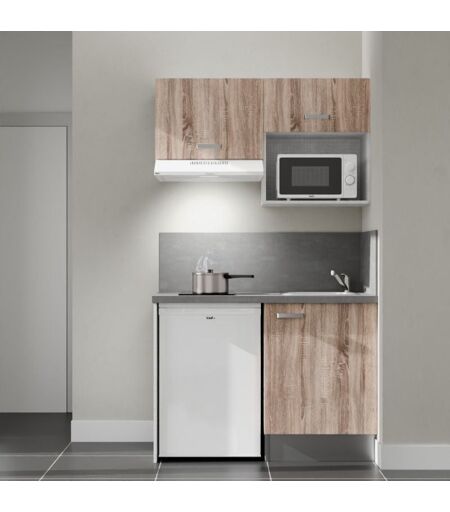 CUISIBANE Kitchenette K02L-PT - 120 cm avec plan de travail et évier - emplacements frigo, hotte et micro-ondes - Façade Bois - Plan Gris béton - Evier Inox
