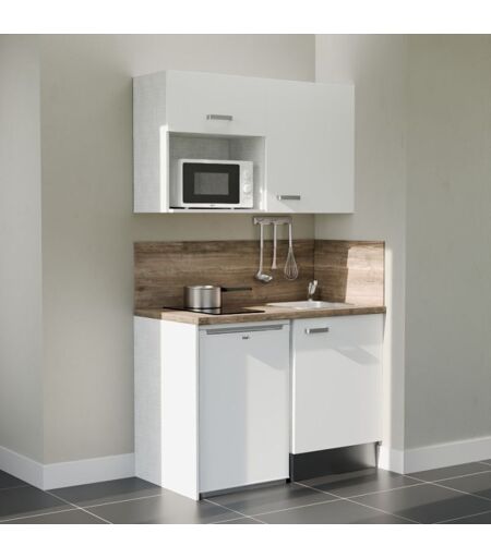 CUISIBANE Kitchenette K07L-PT - 120 cm avec plan de travail et évier, emplacements frigo et micro-ondes - Façade Blanc - Plan Bois - Evier Inox - Crédences Oui