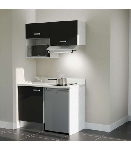CUISIBANE Kitchenette K02L - 120 cm avec plan monobloc, emplacement frigo, hotte et micro-ondes-Noir-Snova-évier à gauche