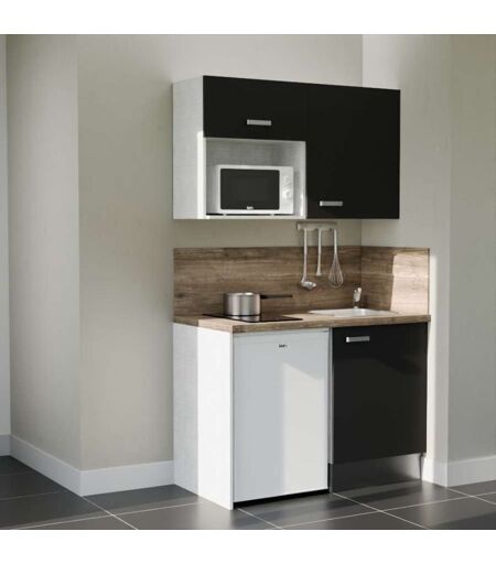 CUISIBANE Kitchenette K07L-PT - 120 cm avec plan de travail et évier, emplacements frigo et micro-ondes - Façade Noir - Plan Bois - Evier Inox - Crédences Oui