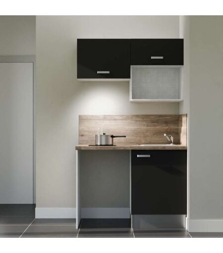 CUISIBANE Kitchenette K02L-PT - 120 cm avec plan de travail et évier - emplacements frigo, hotte et micro-ondes - Façade Noir - Plan Bois - Evier Inox