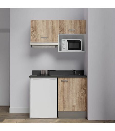 CUISIBANE Kitchenette K02L - 120 cm avec plan monobloc, emplacement frigo, hotte et micro-ondes-Bois-Nero-évier à droite
