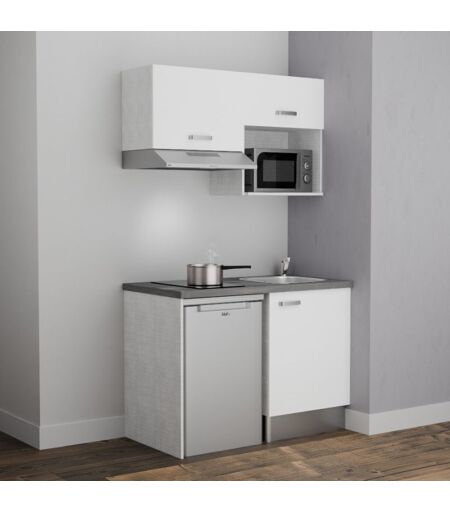 CUISIBANE Kitchenette K02L-PT - 120 cm avec plan de travail et évier - emplacements frigo, hotte et micro-ondes - Façade Blanc - Plan Gris - Evier Inox
