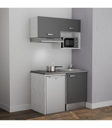 CUISIBANE Kitchenette K02L-PT - 120 cm avec plan de travail et évier - emplacements frigo, hotte et micro-ondes - Façade Gris - Plan Gris - Evier Inox