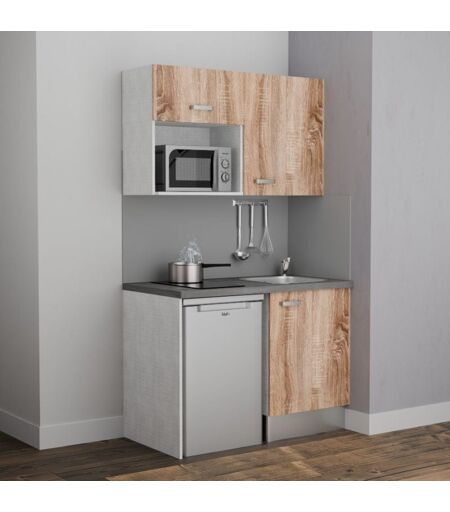 CUISIBANE Kitchenette K07L-PT - 120 cm avec plan de travail et évier, emplacements frigo et micro-ondes - Façade Bois - Plan Gris - Evier Inox - Crédences Non