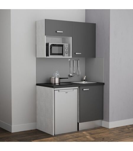 CUISIBANE Kitchenette K07L-PT - 120 cm avec plan de travail et évier, emplacements frigo et micro-ondes - Façade Gris - Plan Noir texturé - Evier Inox