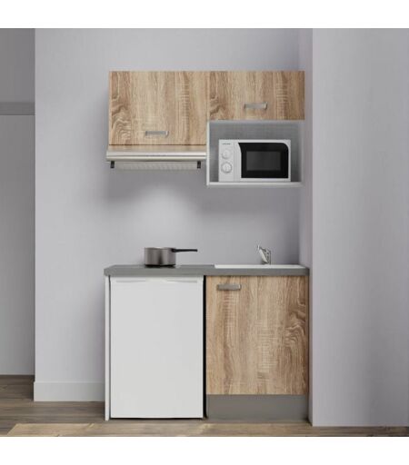 CUISIBANE Kitchenette K02L-PT - 120 cm avec plan de travail et évier - emplacements frigo, hotte et micro-ondes - Façade Bois - Plan Gris béton - Evier Inox